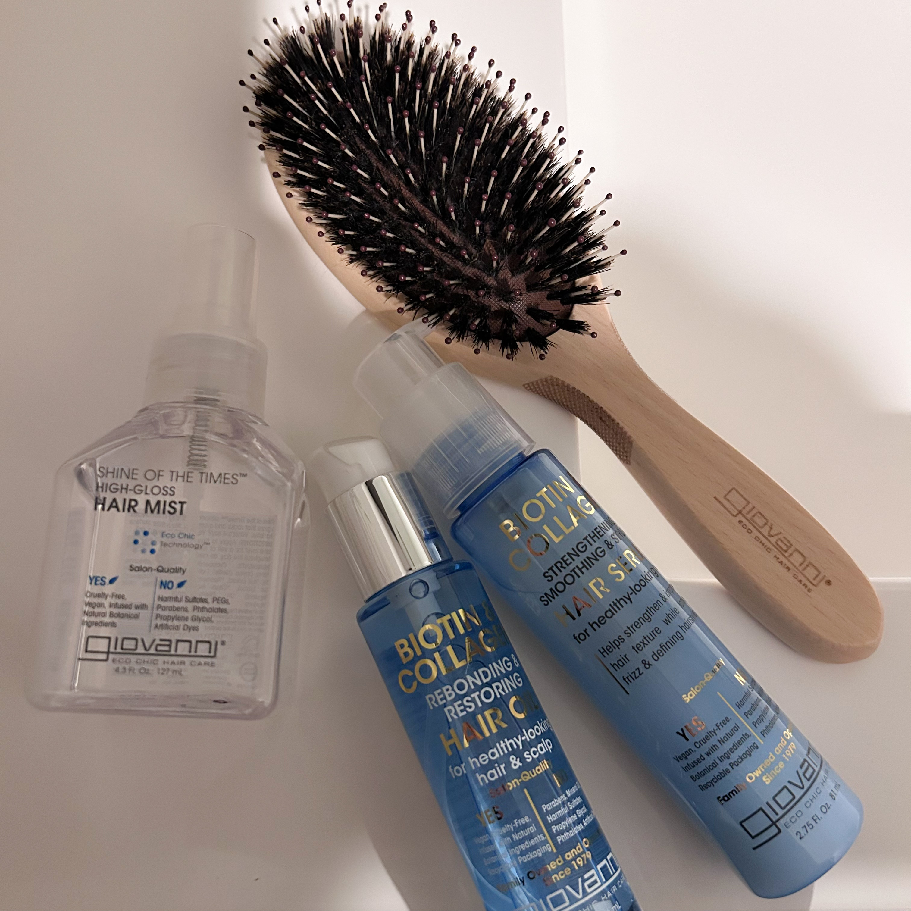 ツヤ髪命!なので、スリーキーブラシ・B&Cスムージングヘアセラム・B&Cヘアオイル・シャインオブザタイムズグロッシーヘアミストが最近のお気に入りです。(全てgiovanni)